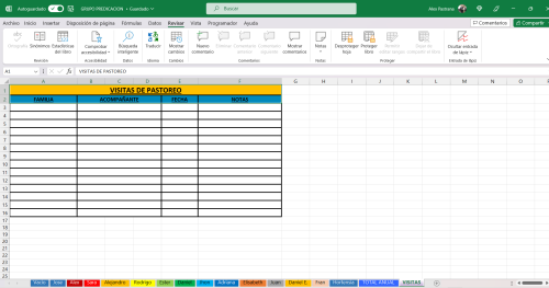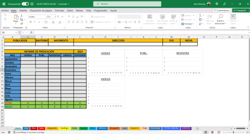 Les presento una plantilla que ayuda a llevar los informes de predicación de los publicadores del grupo de predicación. Podemos incluir el informe de cada publicador junto con sus datos, y esta tabla ayudará a saber los totales y promedios de predicación de cada publicador, pero además los totales y promedios anuales del grupo. Solo es necesario incluir los datos de predicación de cada publicador y el programa hará los cálculos.
