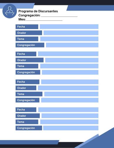 Incluye 4 secciones para anotar 4 semanas. Cada una incluye la fecha en la que se discursará, el orador, el tema del discurso, y la congregación de la que visita el hermano.