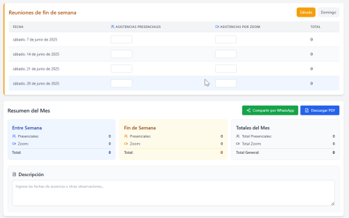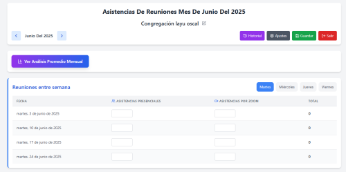 Guarda cuántos asistieron en persona o por Zoom en cada reunión del mes.