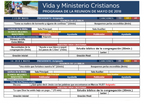 Programa para la reunión vida y ministerio cristianos para el mes de Mayo de 2018