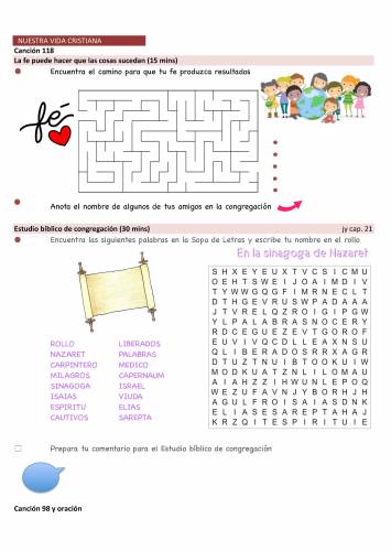 Contiene dos hojas de actividades para niños basadas en la información que se tratará en la próxima reunion de entre semana.