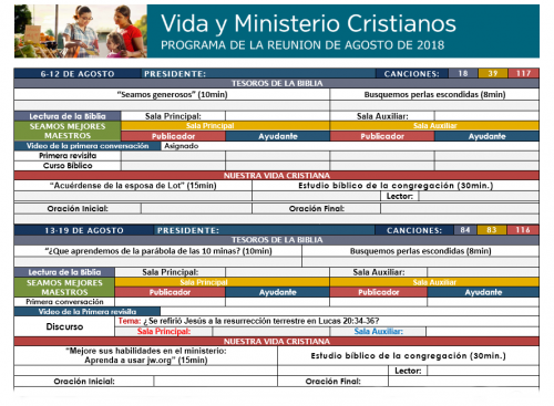 Programa para la reunión vida y ministerio cristianos para el mes de Agosto de 2018