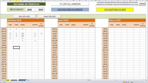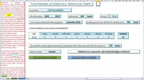 Precursores y demás publicadores pueden planificar, registrar y monitorear las horas que dedican al servicio del campo. En este programa en Excel muy sencillo de usar, el publicador puede trazarse una meta anual de servicio, planificarlo mediante solo anotar cómo trabajará en la semana, ir registrando su informe de servicio y entonces beneficiarse de una página totalmente automatizada que le ayudará a monitorear gráficamente cómo le va en el cumplimiento de su meta. Incluye un instructivo que debe servirle hasta a una persona que nunca haya usado un archivo en Excel.